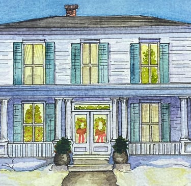 Watercolor postcard of the Thomas R. Marshall home and Whitley County Historical Museum at Christmastime by artist Jennifer Zartman Romano